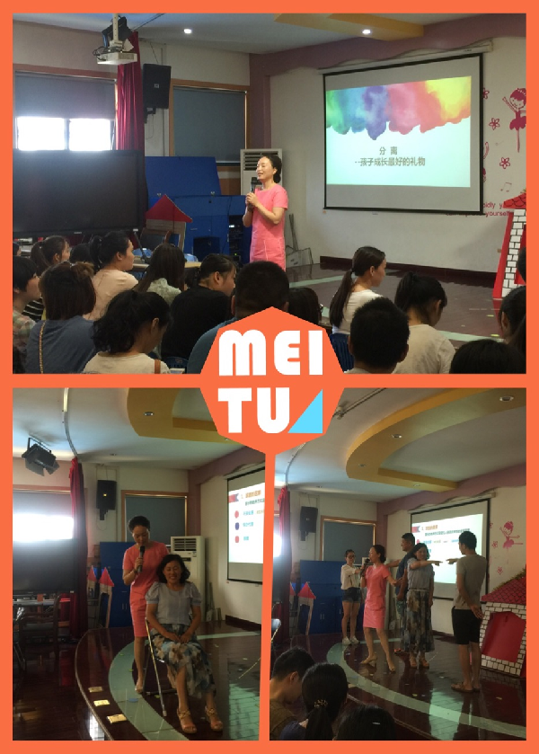 王茜园长以《分离——孩子成长的礼物》这个主题展开,从什么是分离焦虑、孩子分离焦虑的阶段和类型、分离焦虑的原因,家长在家里的应对策略等四大方面娓娓道来,结合了大量的国外研究的视频、案例让家长从视频中幼儿的分离焦虑的表现直观的体验幼儿的感受,从而引导家长更好的帮助幼儿渡过这个分离焦虑期。在讲解中,王茜园长还邀请了现场的教师和家长多次的参与到活动中来,通过直观的演示,家长们充分感受到家庭对于自己对于宝宝的支持的重要性。
