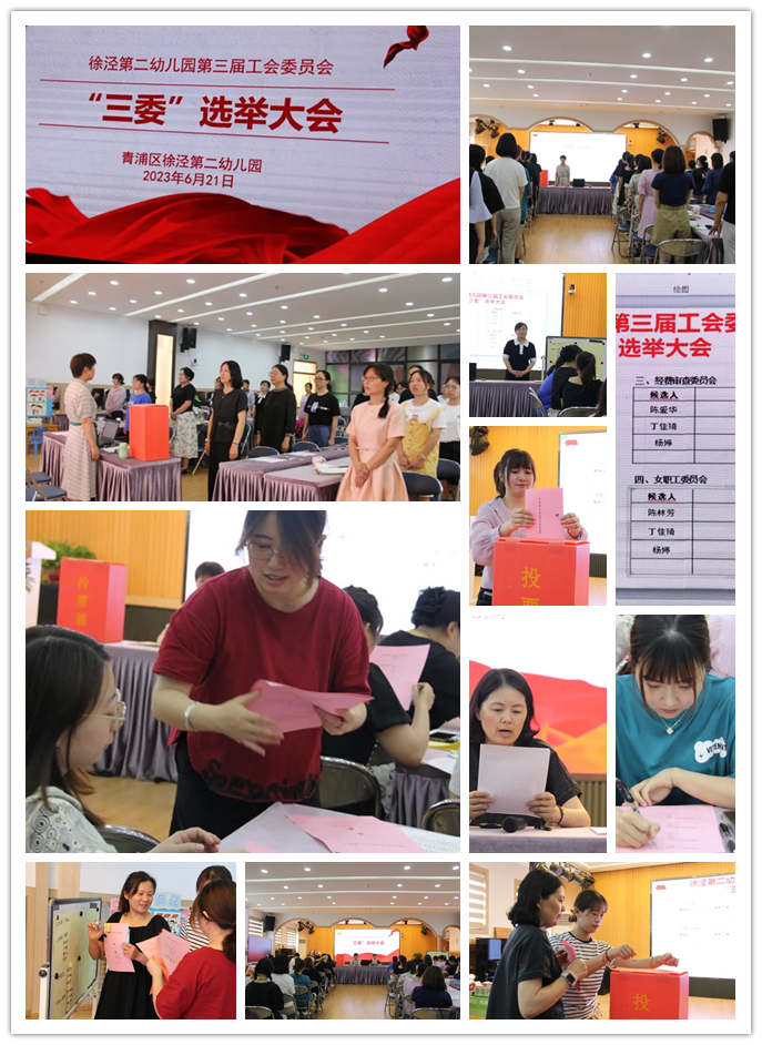 为了进一步加强学校工会组织建设,积极落实上级关于工会换届选举的工作要求,2023年6月21日在徐泾第二幼儿园多功能厅召开了徐泾第二幼儿园第三届工会委员“三委”选举大会。有全体教师会员38名参加,会议由支部书记王芳老师主持。